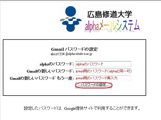 3.「alphaのパスワード」欄には現在のalphaの パスワードを、「Gmailの新しいパスワード」欄にはGmail用(POP/IMAPアクセス用)のパスワードを決め入力してください。